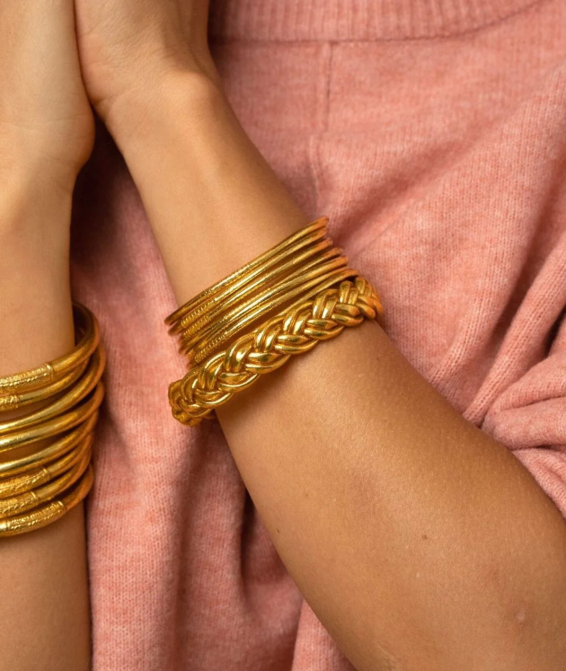 Jonc souple transparent rempli de feuilles dorées décoratives, scellé avec un mantra gravé "Bonheur, Chance, Fortune et Amour" en thaïlandais