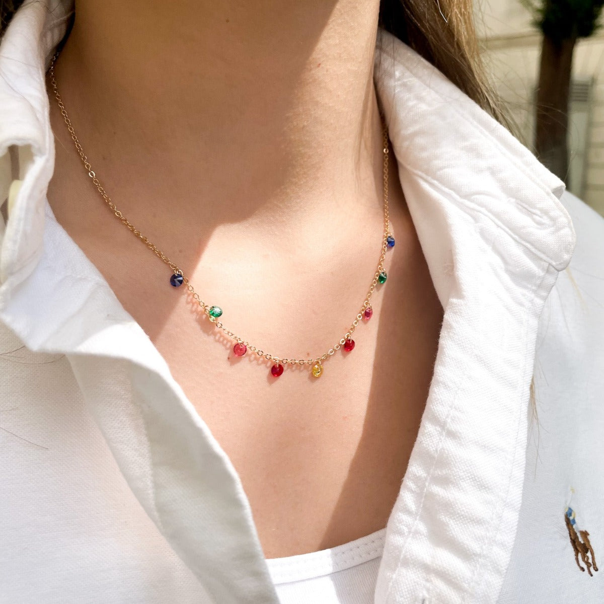 Collier de la collection Gris Bijoux, composé d'une chaine fine en plaqué or avec des pampilles de couleurs différentes : rose, blanc, multicolore, bleu, idéal pour être porté seul pour un look minimaliste et délicat, ou pour être associé à d'autres colliers pour créer une combinaison élégante et personnalisée.